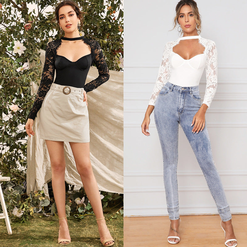 Long-sleeved Lace Low-cut Sexy Backless Erotic Bodysuit